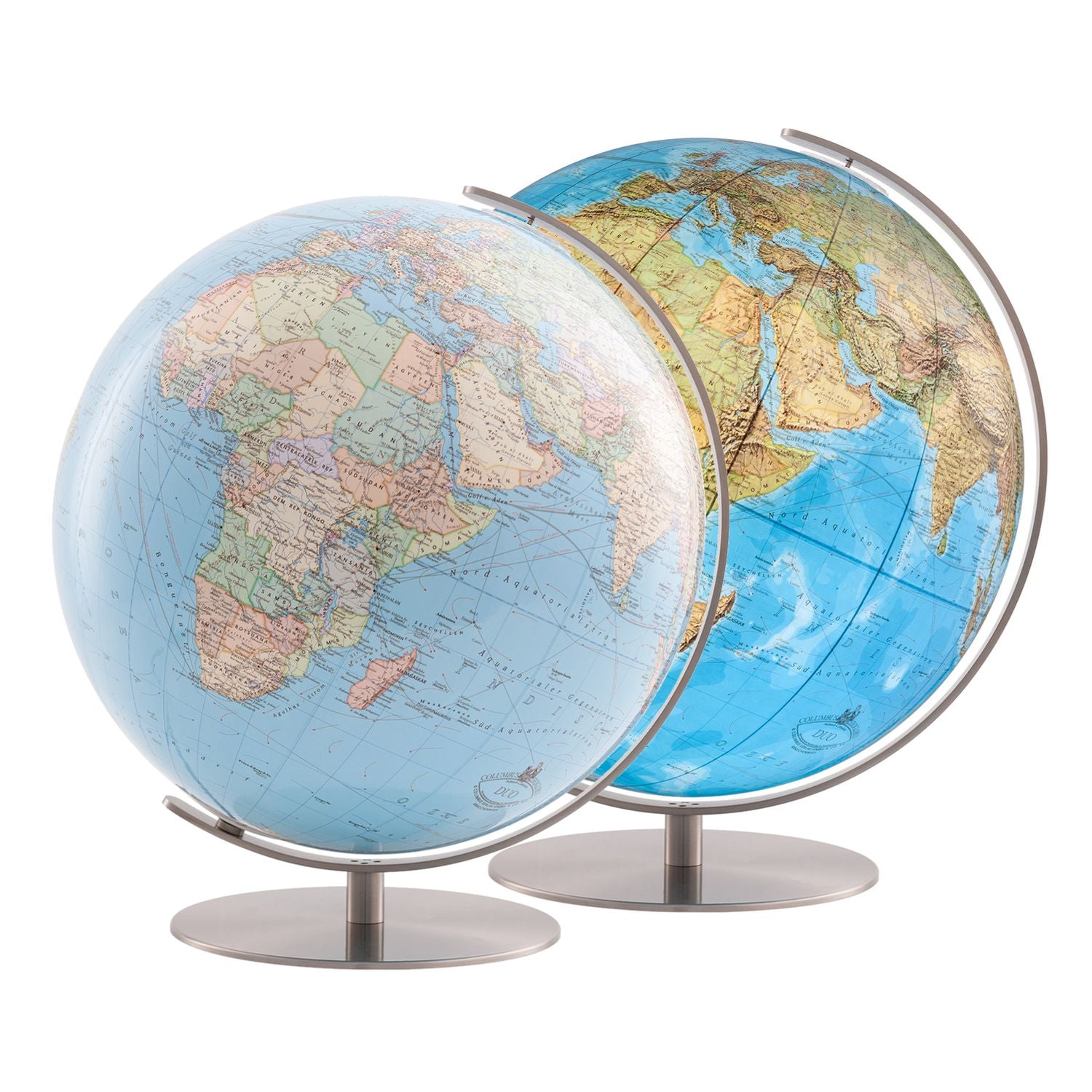 Bitte beachten Sie, dass es verschiedene Varianten des Columbus DUO Leuchtglobusses gibt. Diese unterscheiden sich in der Materialbeschaffenheit der Weltkugel.
