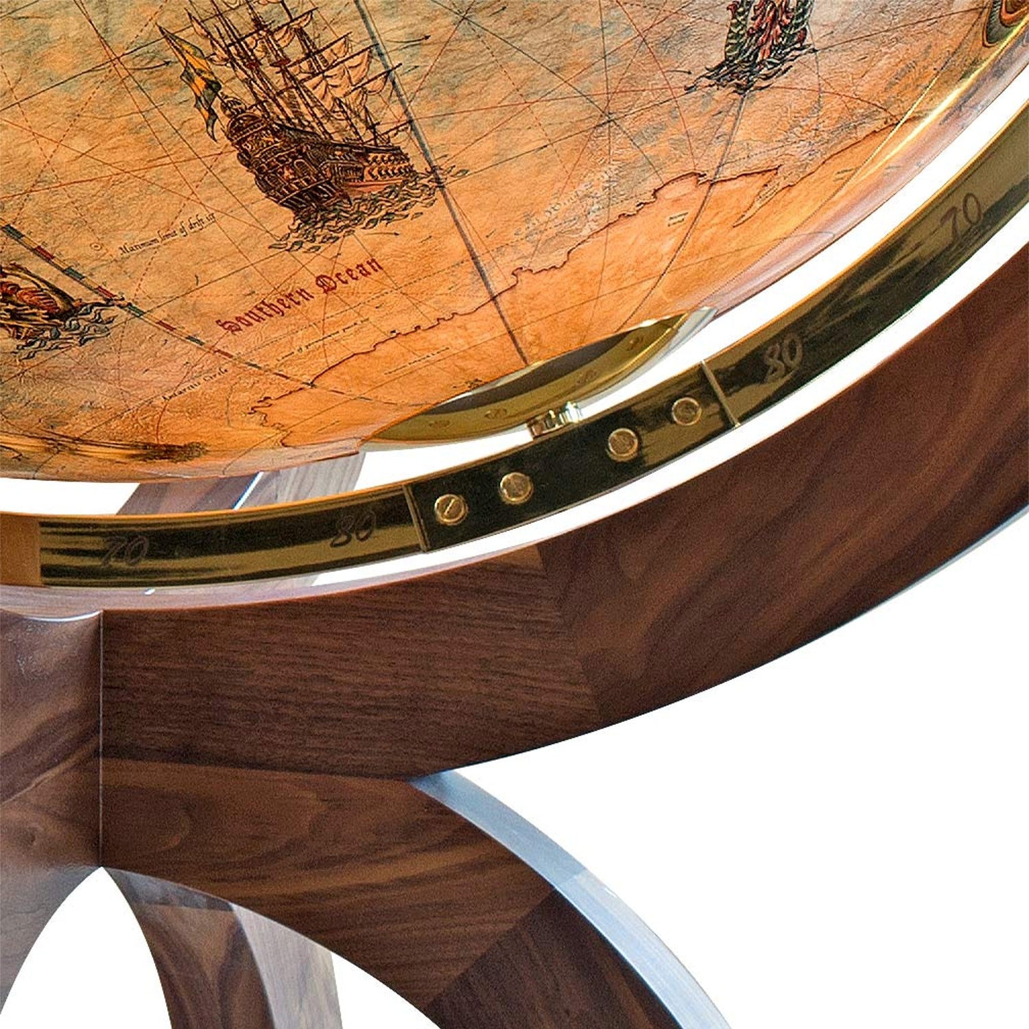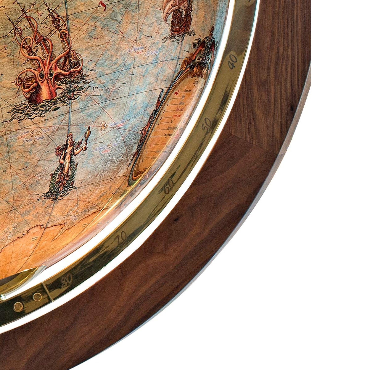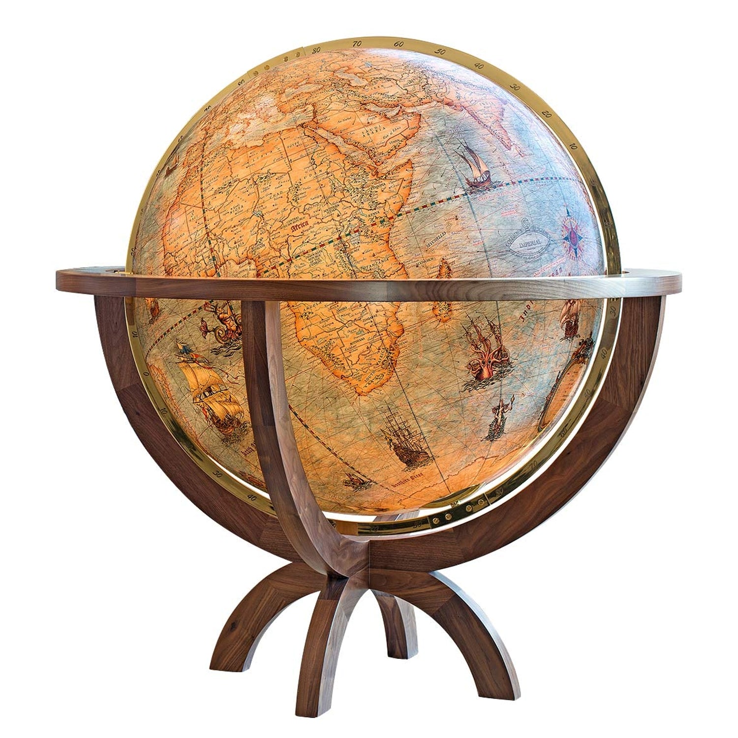 Morsezeichen, das Marinealphabet, faszinierende Fregatten und gefährliche Seeungeheuer entführen den Betrachter in eine historische Welt. Lassen auch Sie sich verzaubern und erlauben Sie dem Magnum Imperial Sie in seinen Bann zu ziehen. Passend zum exklusiven Kartenbild des Magnum Imperial, wurde das Holzgestühl aus besonders ausgesuchtem amerikanischen Nußbaum gefertigt und mit Perlmutteinlagen über den Windrichtungen verziert. Der Vollmeridian aus hochglanzpoliertem Messing ist handgraviert.