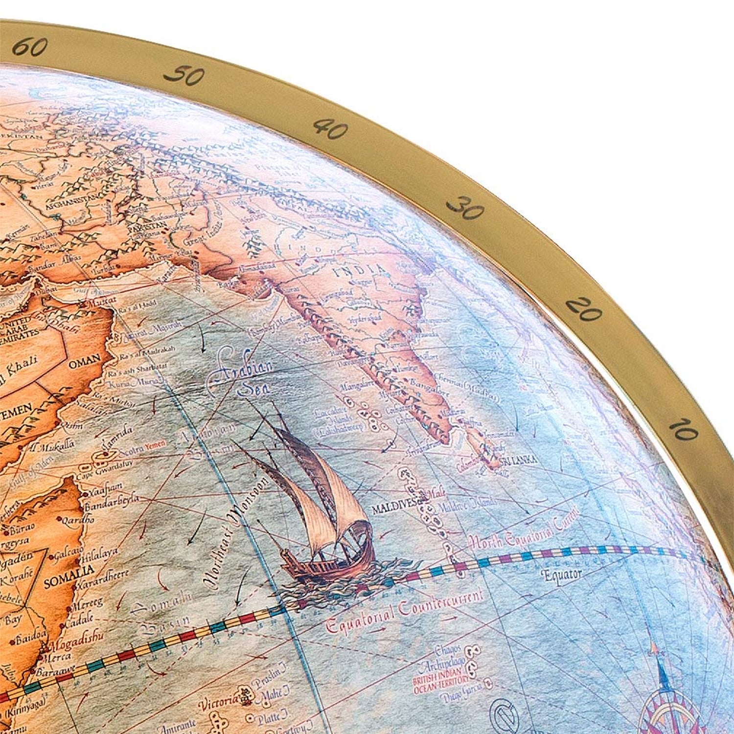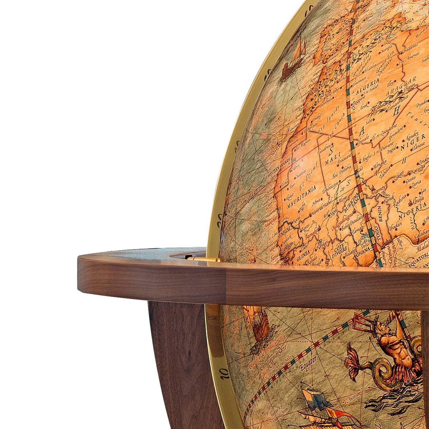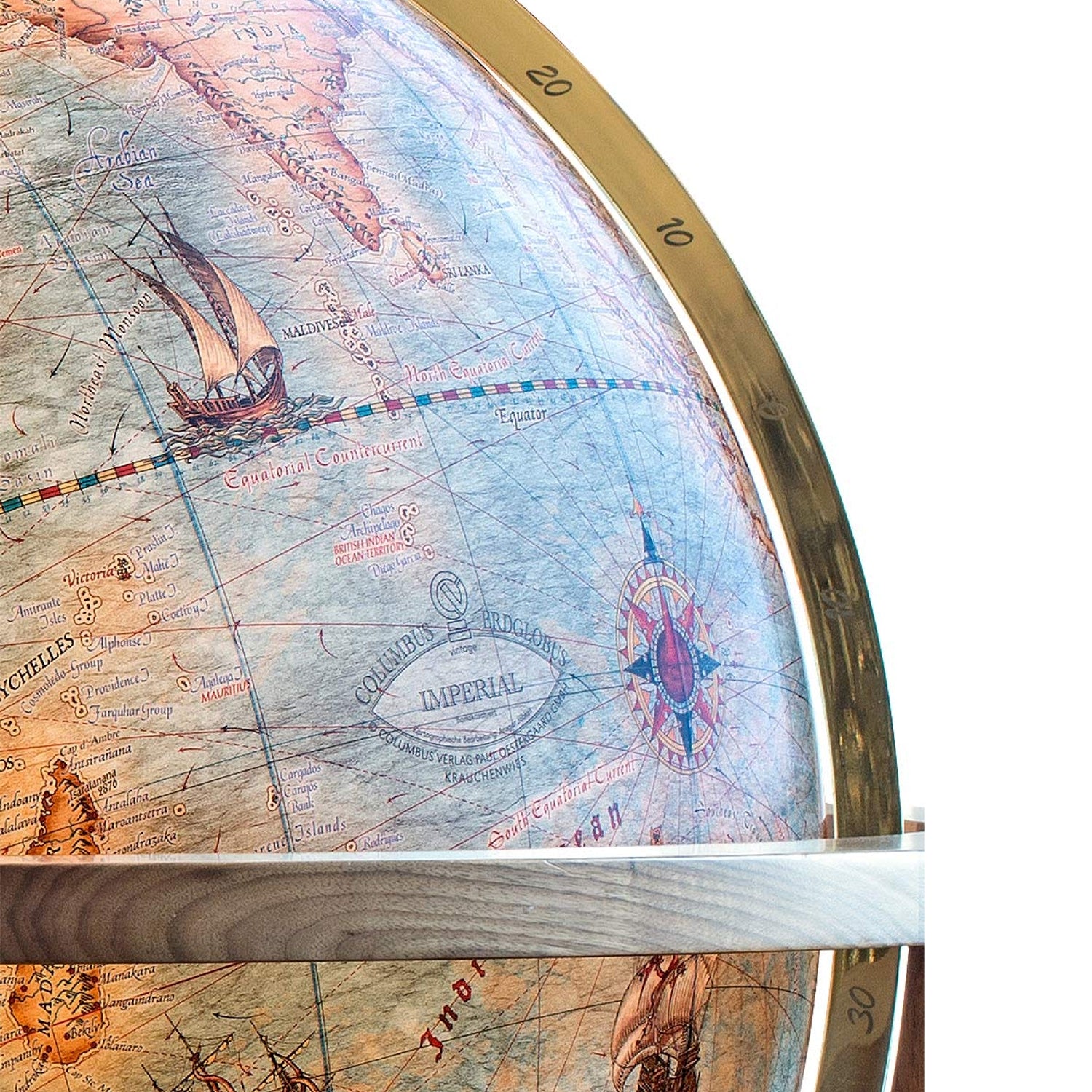 Morsezeichen, das Marinealphabet, faszinierende Fregatten und gefährliche Seeungeheuer entführen den Betrachter in eine historische Welt. Lassen auch Sie sich verzaubern und erlauben Sie dem Magnum Imperial Sie in seinen Bann zu ziehen. Passend zum exklusiven Kartenbild des Magnum Imperial, wurde das Holzgestühl aus besonders ausgesuchtem amerikanischen Nußbaum gefertigt und mit Perlmutteinlagen über den Windrichtungen verziert. Der Vollmeridian aus hochglanzpoliertem Messing ist handgraviert.