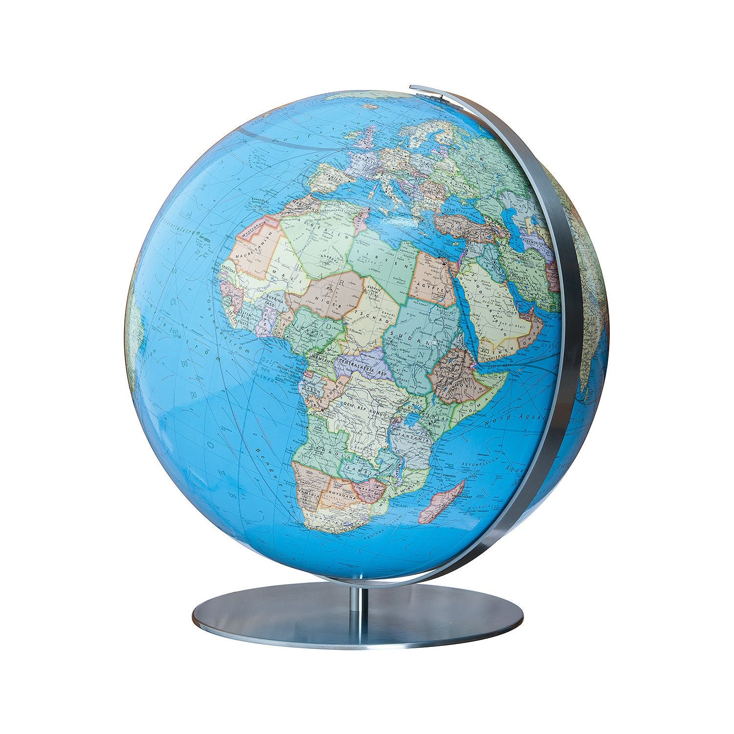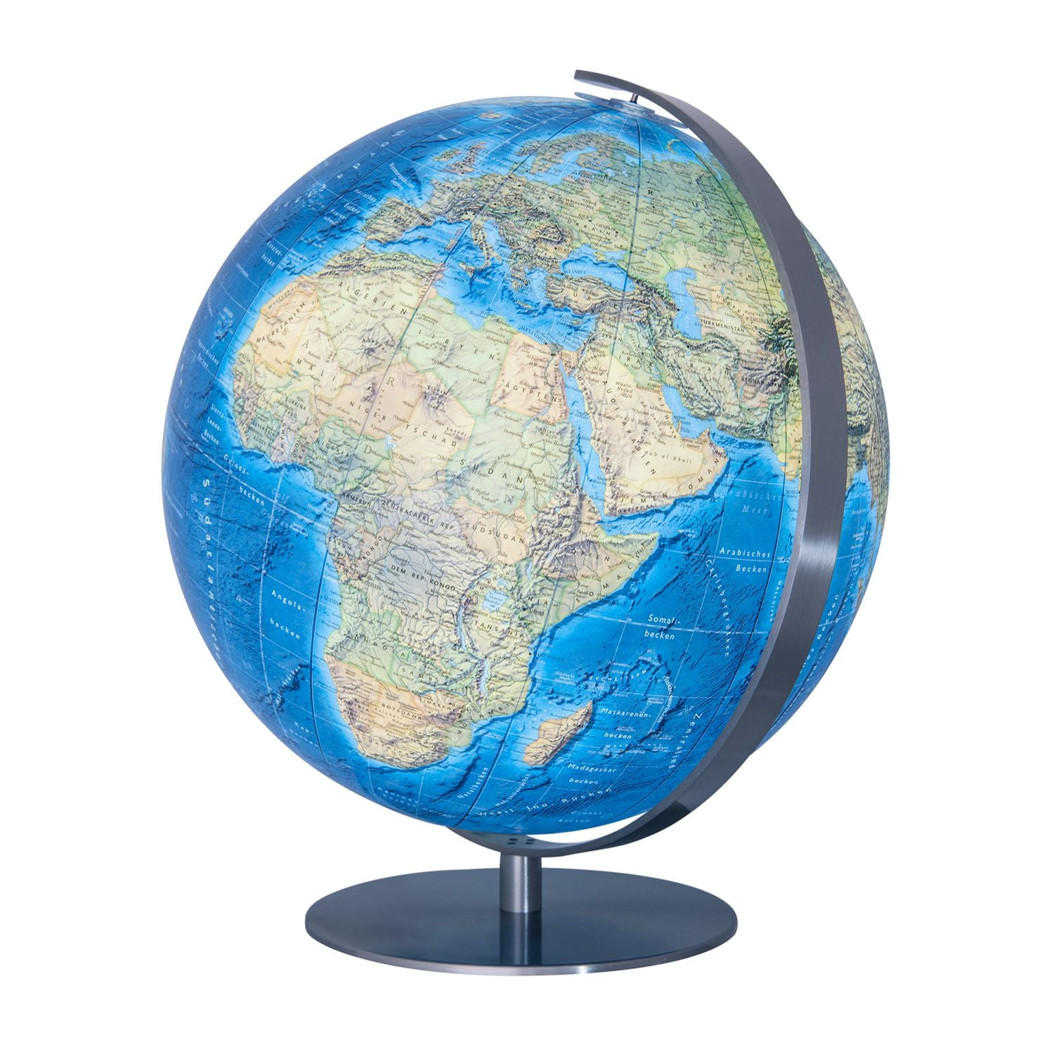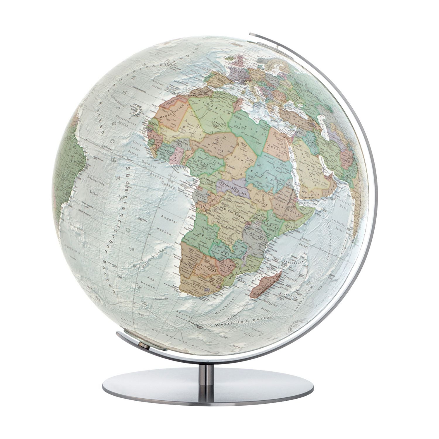 Dank des aufwendig gestalteten Kartenbilds und dem 51 cm Durchmesser, lässt der große Tischglobus auch noch die Entdeckung der kleinsten Details unseres blauen Planeten zu. Mit über eineinhalb Metern Kugelumfang zeigt dieser COLUMBUS Globus unbeleuchtet klar strukturiert das aktuelle politische Kartenbild unserer Erde. Beleuchten Sie den Globus, wechselt er zum physischen Kartenbild. Der große Tischglobus von Columbus ist in verschiedenen Ausführungen des Kartenbildes erhältlich.