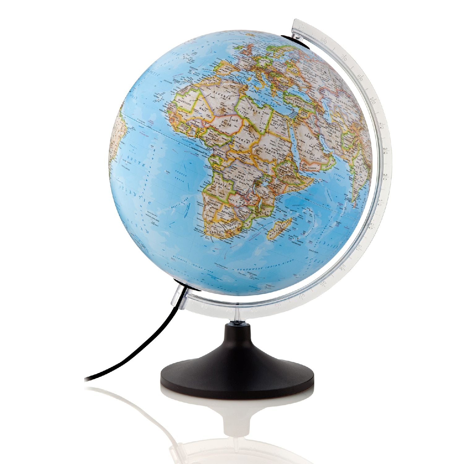 Die Weltkugel ist mit einem transparenten Meridian eingefasst. Der Fuß ist aus schwarzem Kunststoff und mit einer Metallplatte verstärkt, wodurch der Globus eine zusätzliche Stabilität bekommt. Der Globus hat eine Gesamthöhe von 42 cm.