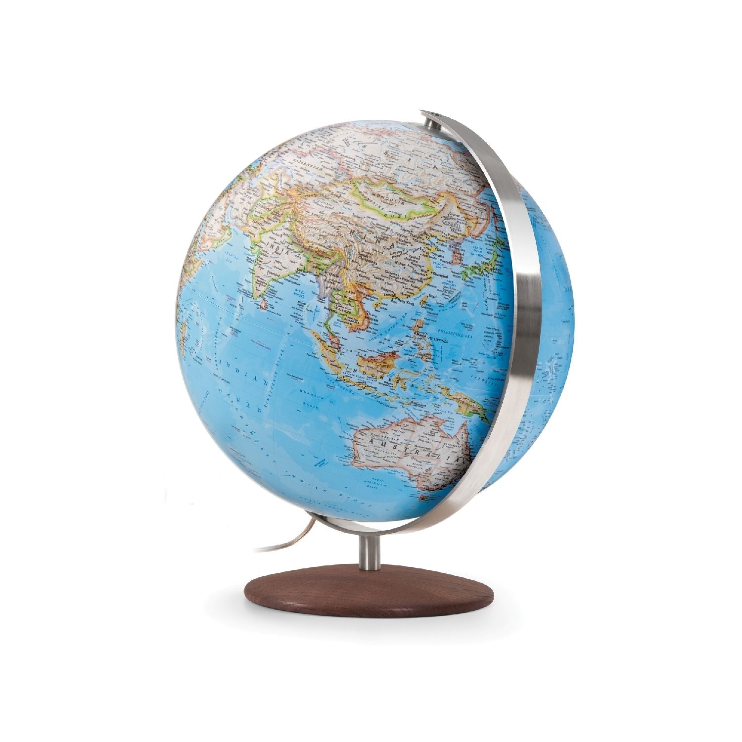 Die Weltkugel ist mit einem Meridian aus gebürstetem Edelstahl eingefasst und sitzt auf einen edlen Fuß aus Holz. Der Globus hat eine Gesamthöhe von 39 cm.