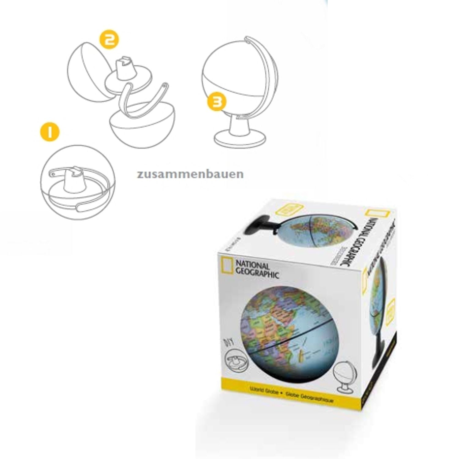 Die Weltkugel wird in ein schwarzes Kunstoffgestell zum selbst montieren eingefasst. Der Globus hat eine Gesamthöhe von 22 cm.