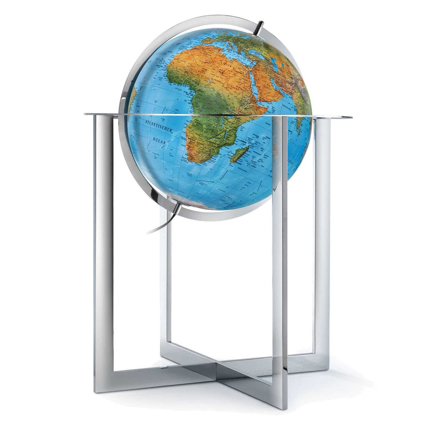 Dieser repräsentative Stand-Leuchtglobus verbindet auf gekonnte Art und Weise Tradition und Moderne. Eine traditionell von Hand kaschierte Kugel mit einem Durchmesser von 50 cm, einer anwenderfreundliche Höhe von 103 cm und einer auf aktuellen Satellitendaten und -bildern basierenden physischen Kartografie, wird mit einem modern designten Gestell kombiniert.